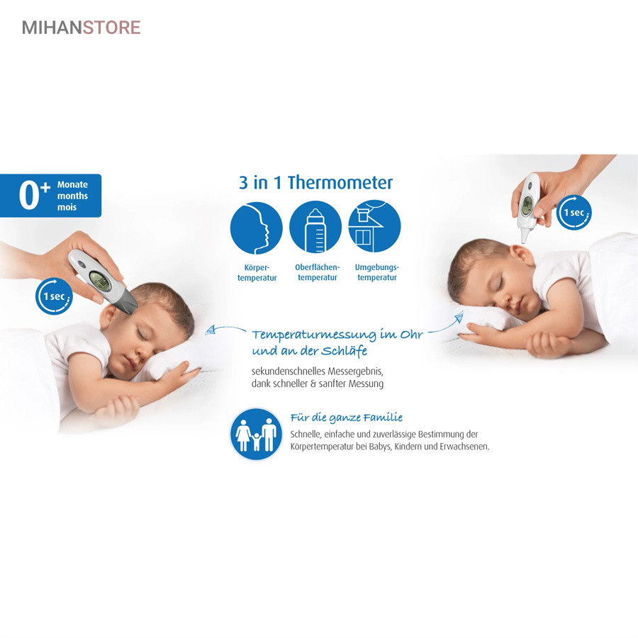 یک دستگاه با رابط کاربری بسیار آسان و میزان دقت بسیار قابل قبول است. این دستگاه با ابعاد کوچک و مناسب خود آن را برای حمل و نقل بسیار آسان کرده و استفاده از آن را بسیار آسان. خاموش شدن دستگاه بعد از یک دقیقه به صورت خودکار در صورت عدم استفاده، میزان مصرف انرژی آن را بسیار کاهش داده. این دستگاه تب سنج بسیار با کیفیت و ساخت کشور آلمان بوده و از طریق پیشانی و یا گوش می توان تب بسیار دقیق (بدون هیچ خطایی) را سنجید.